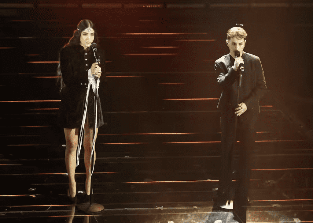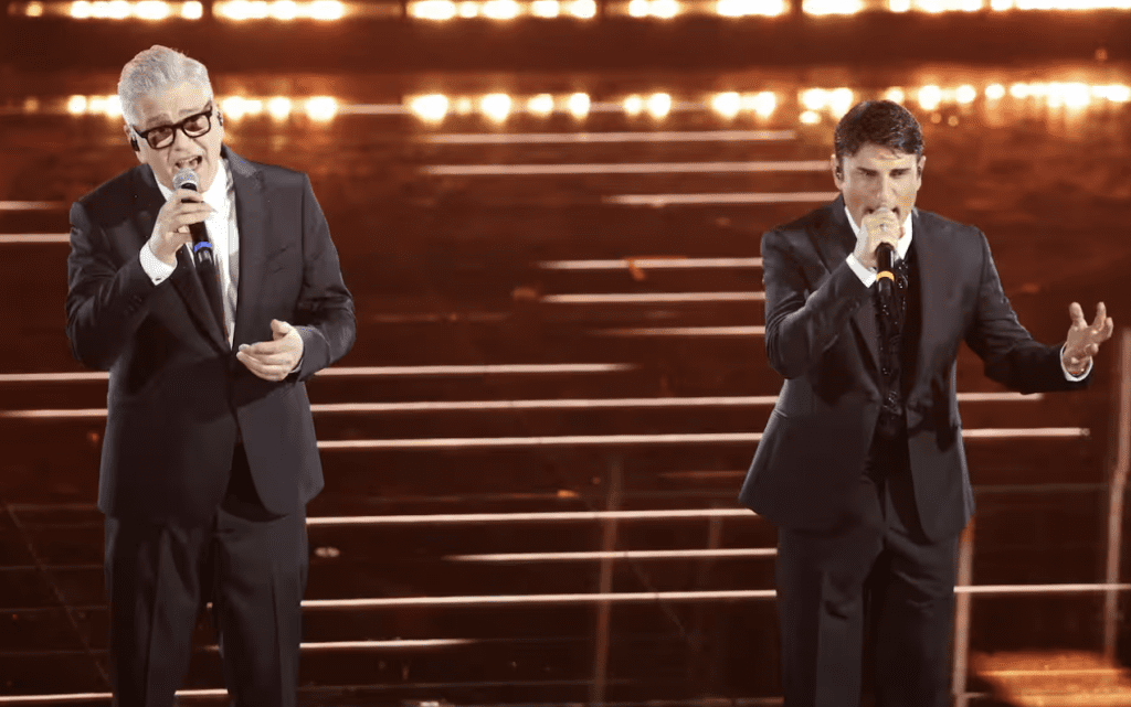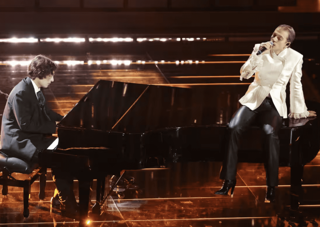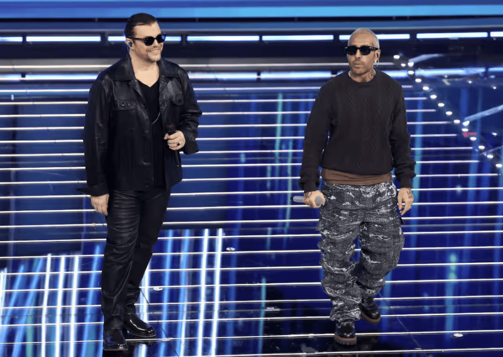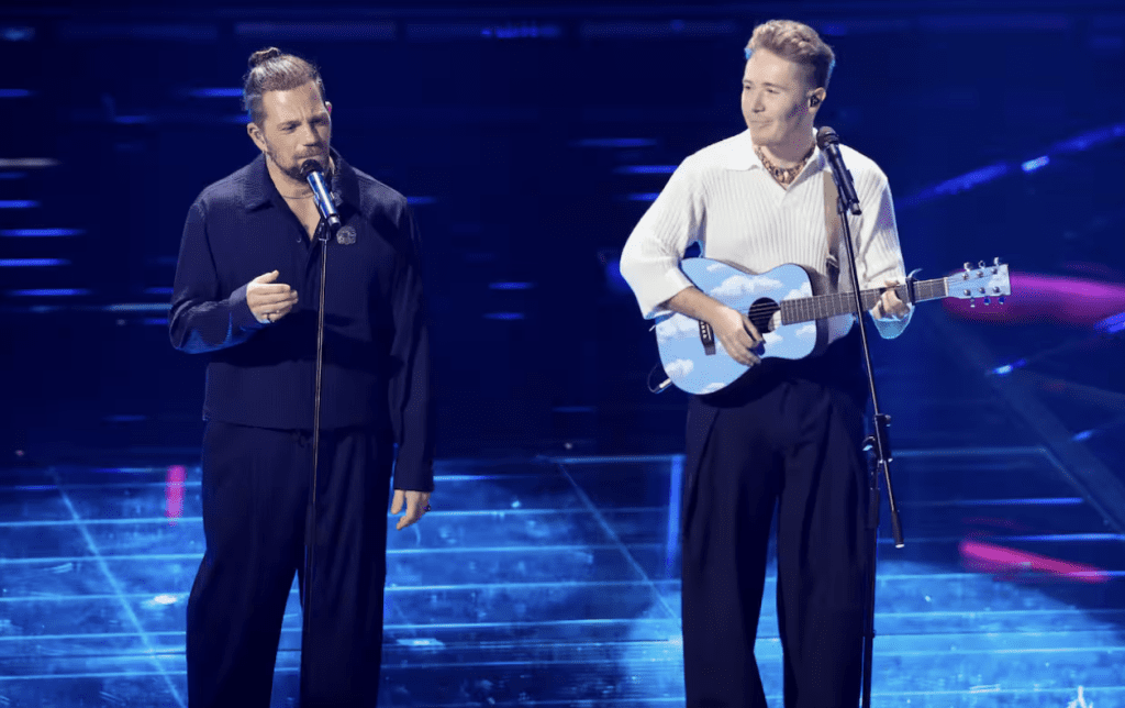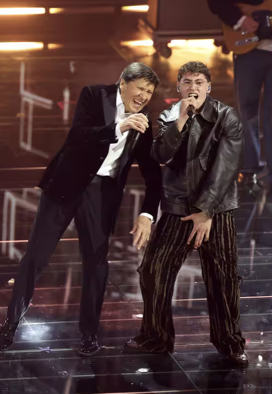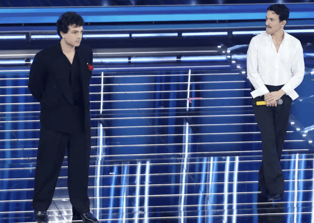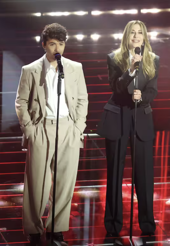 Outfit in L.B.M. 1911: eleganti, puliti, senza strafare. Funzionano visivamente. La canzone è una scelta ambiziosa. Aiello a tratti sembra imitare Mahmood nelle dinamiche vocali, ma non disturba più di tanto. L’intesa c’è, la performance è solida. Forse in alcuni passaggi hanno esagerato con l’intensità, caricando troppo certe parti che avrebbero funzionato meglio con più misura.