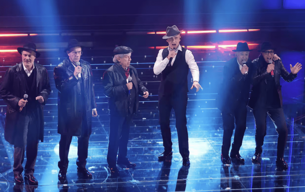 Sembrano i vecchietti del paese che cantano in piazza. E invece sono perfetti. Divertenti, autoironici, vivi. È uno dei momenti più spontanei della serata. Il balletto, la complicità, il tono leggero ma intelligente. Smontano tutto senza distruggere nulla. Non c’è nulla da perdonare, nulla da giustificare.