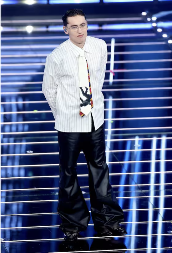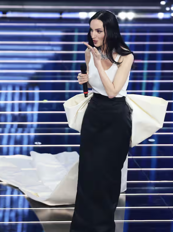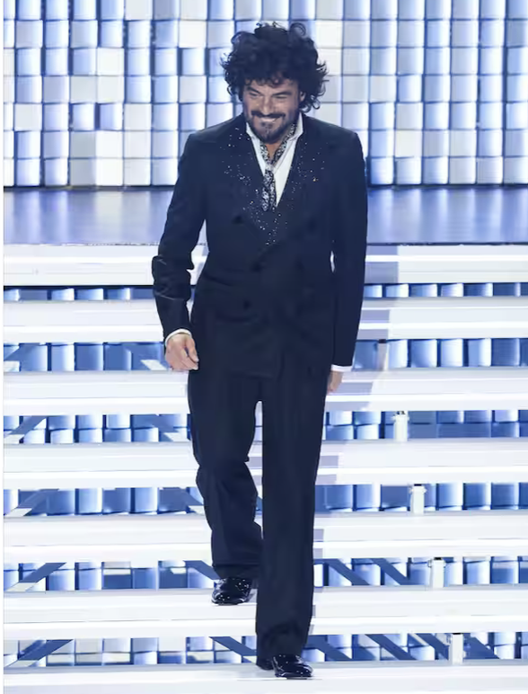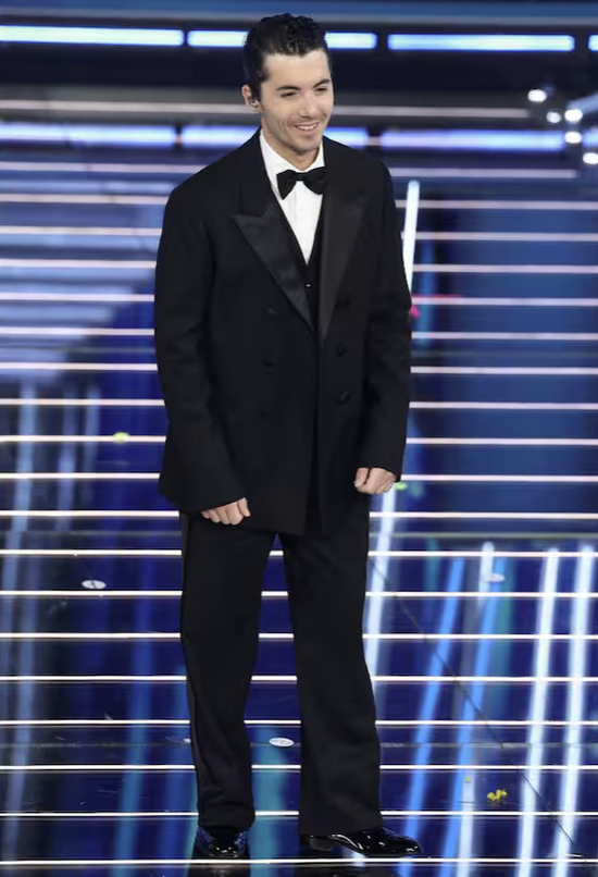 Ha mantenuto per tutta la settimana uno stile da gran sera impeccabile. In finale chiude con smoking, giacca bianca e fiocco largo in seta. Il fiocco mi lascia perplessa: troppo evidente, un po’ effetto cravattino da supereroe. Avrei scelto qualcosa di più sobrio. Ma quando tutta la platea canta e si alza in piedi, il dettaglio passa in secondo piano. Ha vinto perché la sua canzone è entrata nelle case, nei social, nelle teste.