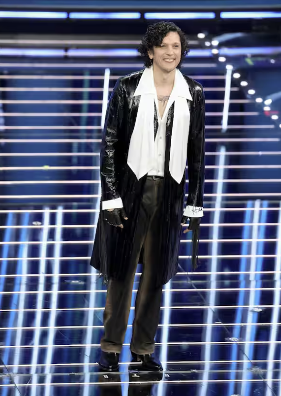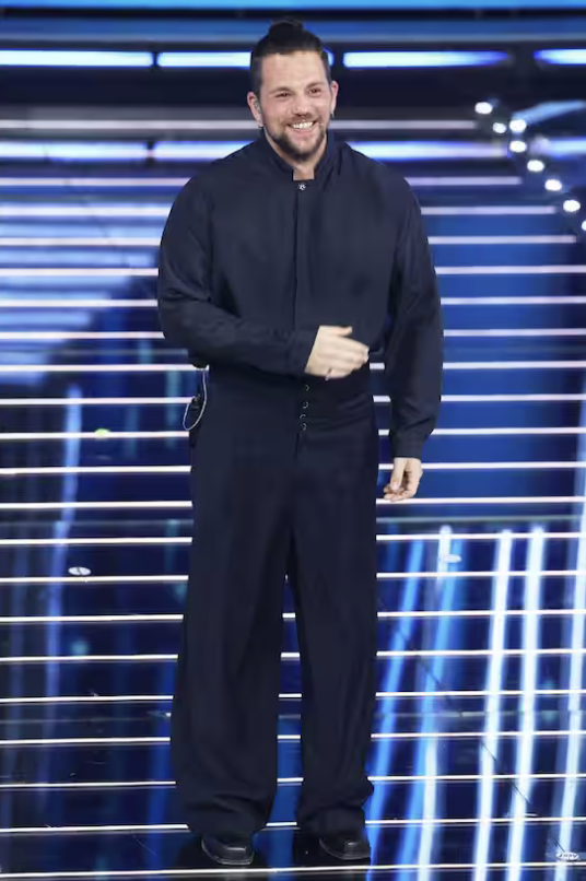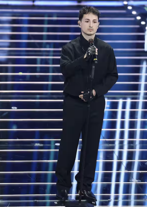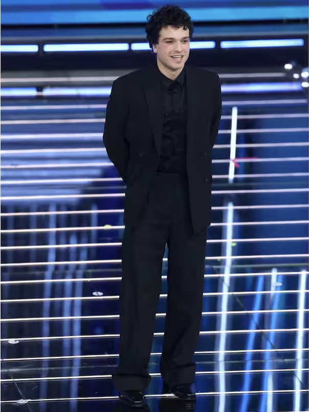 Sul fronte look torna essenziale e preciso: abito nero firmato Saint Laurent con blazer dai revers ampi e una rosa applicata. Elegante, coerente, adatto alla serata. Dopo il dandy dei duetti, qui è più centrato. Qualche imprecisione vocale resta, ma se l’energia generale funziona, certe sbavature passano in secondo piano. Non è stato travolgente, ma è stato credibile.
