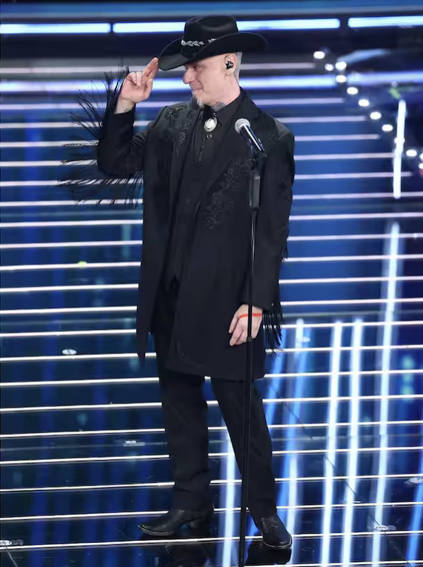 Prosegue con la sua estetica western chic: completo sartoriale total black con frange, omaggio dichiarato a Johnny Cash. E il dettaglio dei cappelli esteso anche all’orchestra è un colpo scenico simpatico e coerente.