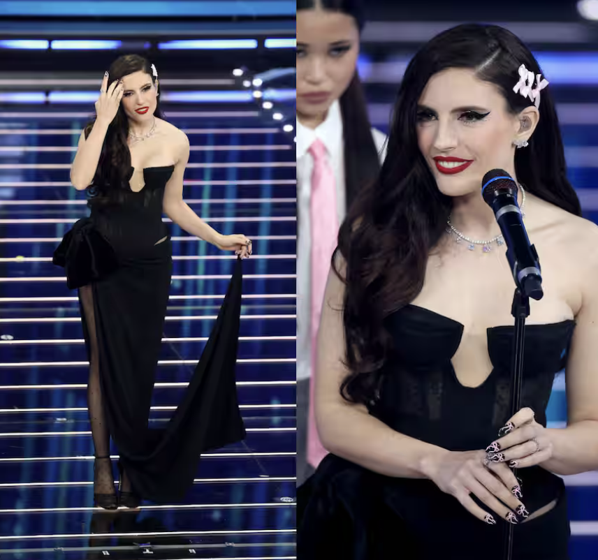Ditonellapiaga arriva in finale coerente con il percorso stilistico costruito sera dopo sera. In Dsquared2 con gioielli Miluna, mix perfetto tra rétro, ironia e dettagli coquette. Manicure con fiocchi coordinata ai nastri nei capelli: tutto pensato, tutto centrato.
