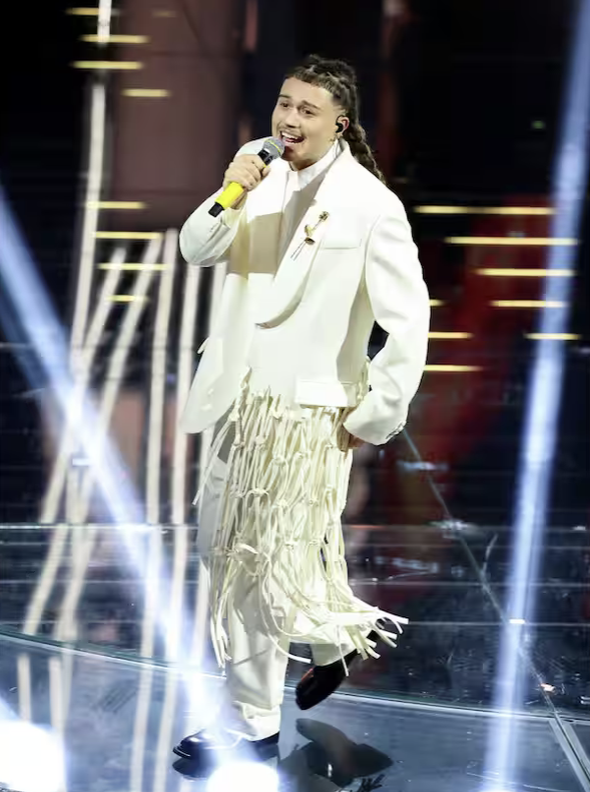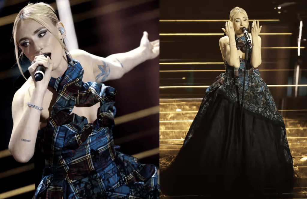 L’abito però non convince del tutto. È scenografico, ma non armonioso. E se non ci fosse l’autotune l’esibizione perderebbe stabilità. La voce fatica, l’insieme regge più per carisma che per tecnica.