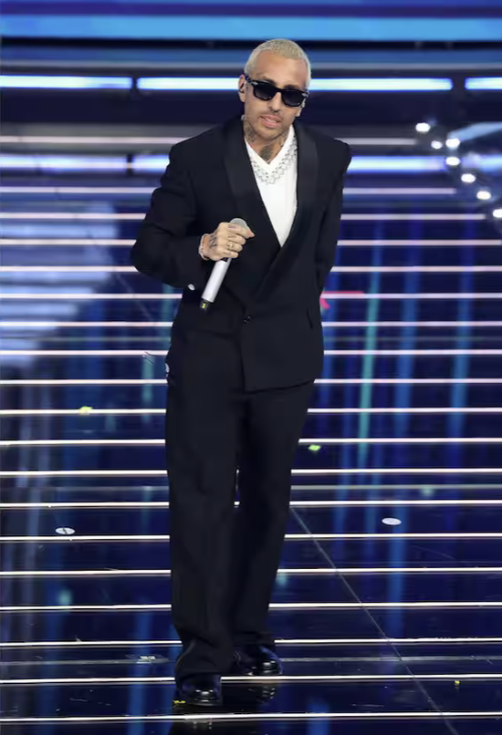 Tommaso Paradiso chiude il suo Festival in bianco e nero: completo nero, camicia bianca, tutto firmato Emporio Armani. Essenziale, pulito, senza rischi.