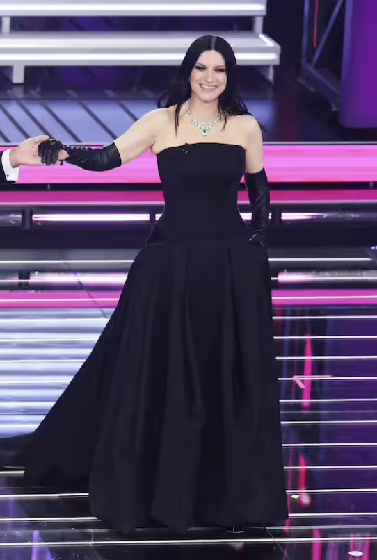 Laura Pausini per la finale torna alla sua comfort zone: nero,  Balenciaga. Abito strapless con scollatura lineare, impreziosita da un collier importante di Bvlgari con diamanti e smeraldi che probabilmente vale quanto un appartamento vista mare a Sanremo. Bello? Sì. Necessario? Forse no. E poi i guanti lunghi in pelle. Ancora. Continuano a darle quell’aria da caposala appena uscita dalla sala operatoria. Eleganza chirurgica, letteralmente.