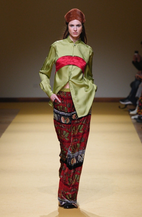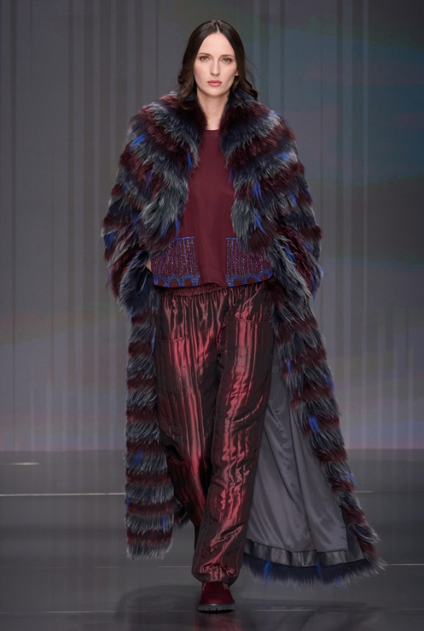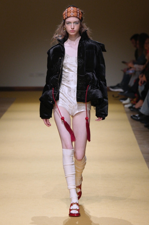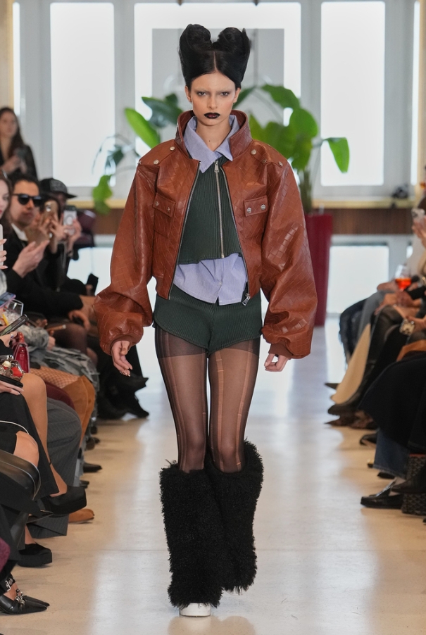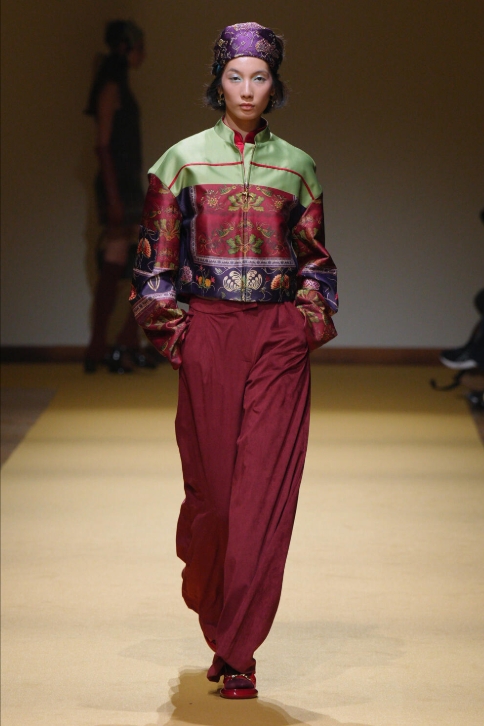 La collezione gioca tra Italia e Cina, mescolando forme, materiali e lunghezze: giacche classiche e gonne a ruota si alternano a lycra color block e stampe vivaci. Al centro c’è la pelle, protagonista grazie alla collaborazione con Lineapelle: materiali innovativi che imitano il denim anni ’80 e intarsi maculati trasformano i capi in veri statement piece, tra tradizione artigianale e sperimentazione.