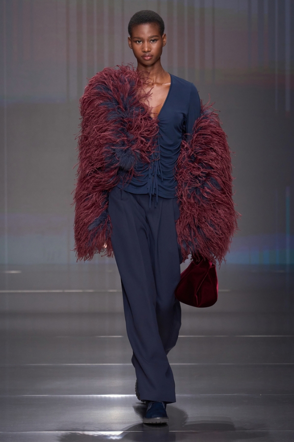 Ma c’è qualcosa di nuovo in questo nuovo Armani. Giacche effetto ciniglia, trench in pelle e boleri di piume che riscrivono l’outerwear. La sera diventa più teatrale: kimoni ricamati in lurex, tuniche sopra i pantaloni, superfici increspate che sembrano paesaggi montani. Un omaggio all’Oriente che ha sempre attraversato il vocabolario Armani, ma con uno sguardo fresco.