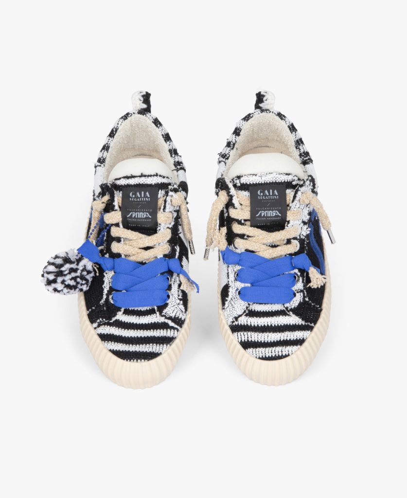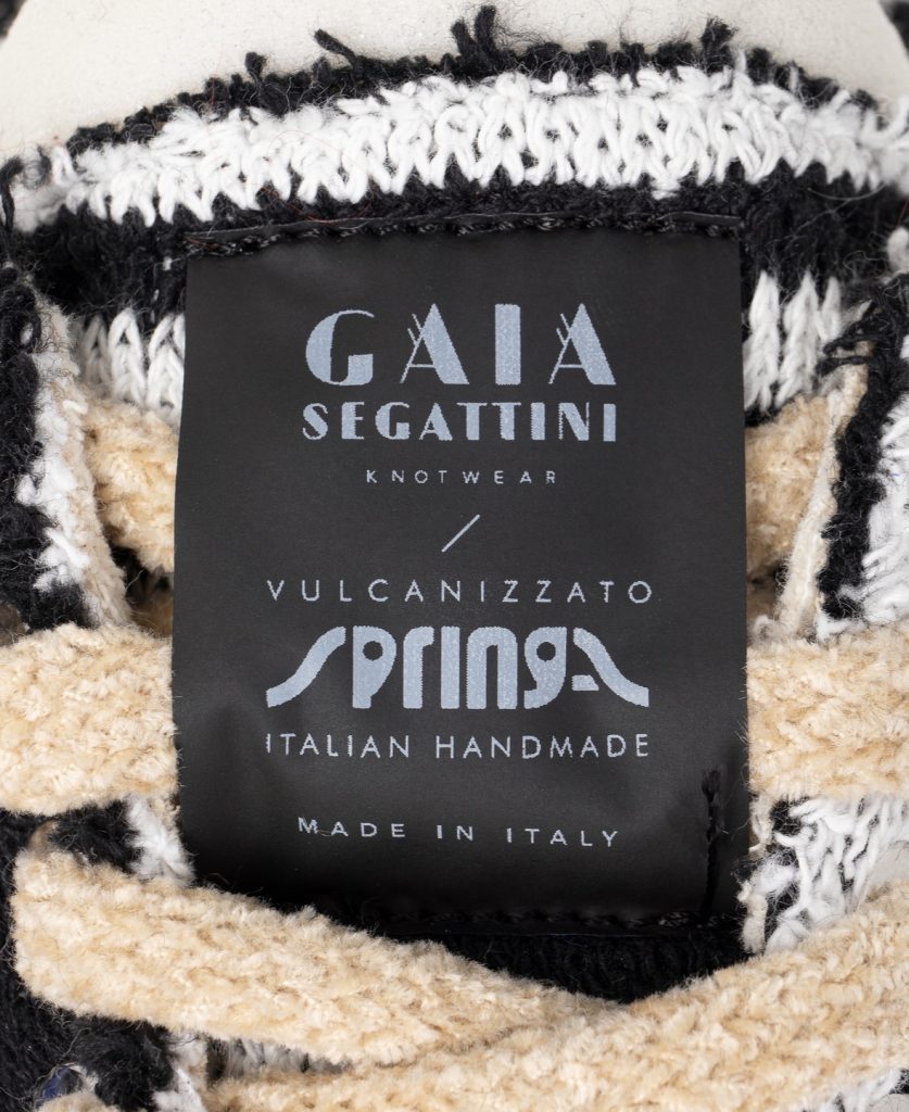 Dalla collaborazione tra Springa e Gaia Segattini Knotwear nasce una sneaker in edizione limitata che unisce vulcanizzazione in autoclave, maglieria rigenerata e design pop.