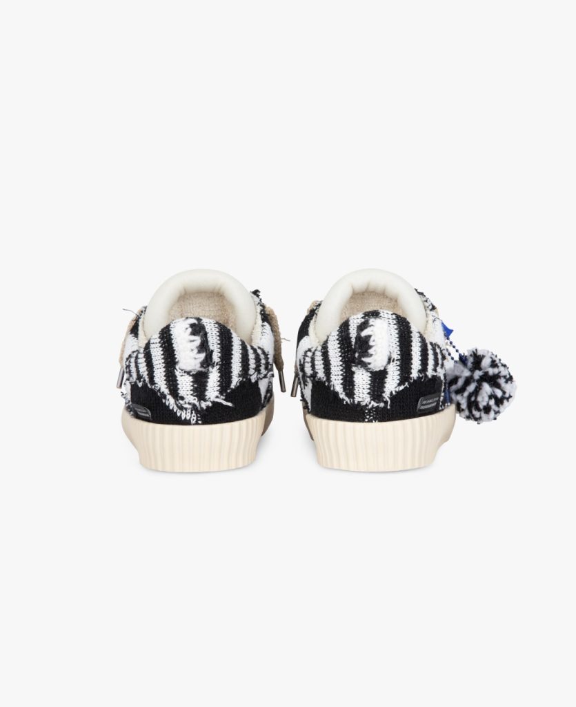 La filosofia della collaborazione si riflette anche nel packaging: una scatola progettata per durare, laserata su doppio cartone e legno naturale, prodotta nelle Marche e decorata con il pattern optical istituzionale di Gaia Segattini Knotwear. A completare il design, un pompon laterale staccabile aggiunge una nota ludica e distintiva, richiamando l’anima giocosa e musicale del brand di maglieria. Il risultato è una sneaker contemporanea che ridefinisce il concetto di calzatura sostenibile, unendo recupero, espressività pop e lavorazione d’eccellenza.